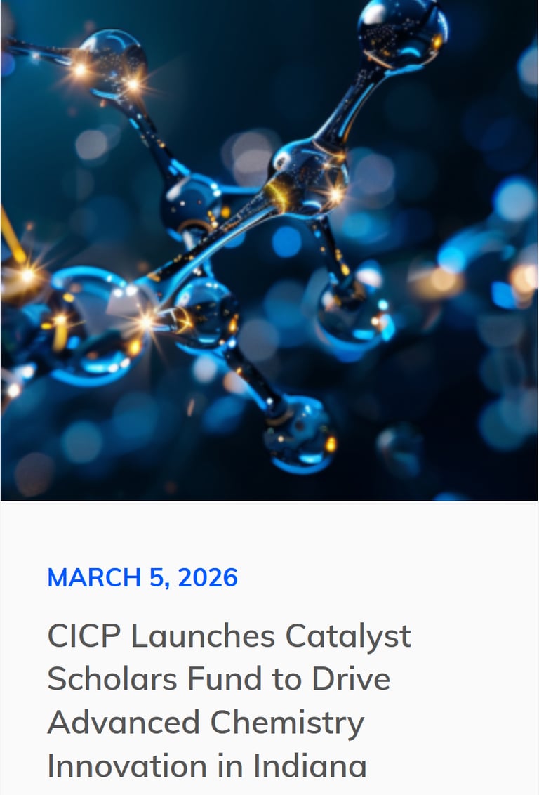 Catalyze Indiana is a multi-stakeholder initiative to position Indiana as the national hub for advanced chemistry manufacturing and innovation, convening three Fortune 500 life sciences corporations, four R1 research universities, and Rose-Hulman Institute of Technology around shared technology priorities, talent pipelines, and manufacturing infrastructure.